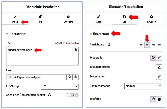 Überschrift bearbeiten / Stil / Ausrichtung: zentriert, Textfarbe: schwarz-blau