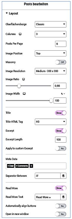 Wählen Sie zwischen verschiedenen Layouts wie „Grid“, „Masonary“ oder „Carousel“. Jedes Layout hat seine eigene Darstellung und kann je nach Bedarf angepasst werden. - Beitragsanzahl: