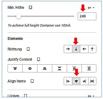 Container bearbeiten / Layout / Elemente / Richtung: horizontal