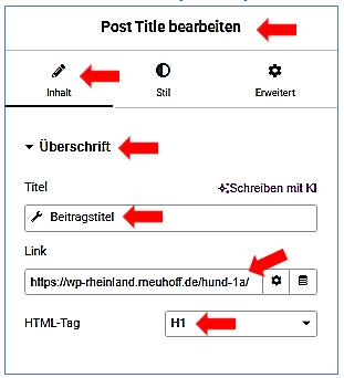 - Ergebnis: Wenn der Beitrag „Hund 1a“ lautet, wird automatisch „Hund 1a“ als Überschrift angezeigt.