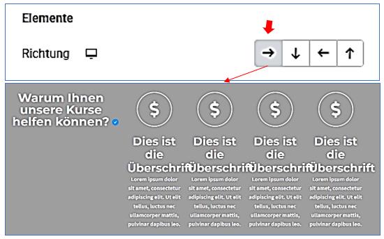 Container bearbeiten / Layout / Elemente / Richtung: horizontal